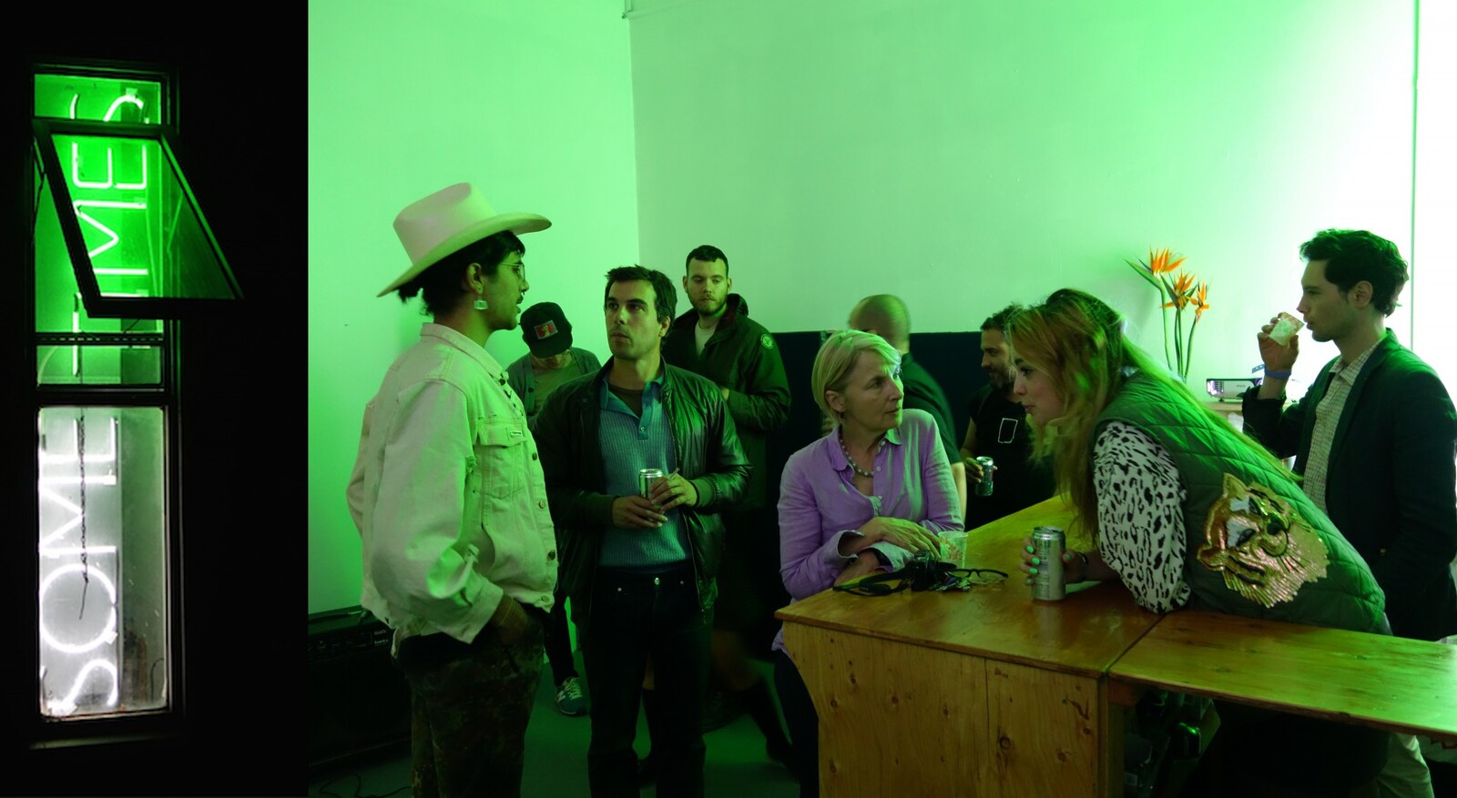 I move on to my first scheduled studio visit, meeting second year MFA educatee Meghan Gordon at her bar. Gordon began some times in her own studio (which the neon sign in the narrow studio window advertises). It's tucked down a cement walkway alongside eucalyptus trees in the Broad Studio Buildings at the border of campus. One of 34 grad students in the Schoolhouse of Art (with 15 more in Photography and another 5 in Fine art & Technology), Gordon's manifold practice is an impressive conglomeration of social organizing. In improver to the bar, she hosts an informal lecture/dinner series chosen In-due north out, co-directs an unofficial residency programme at the Establish called locksmith, Inn, and is a member of neverhitsend, described in her bio as "a collective performatively researching communications ideology."